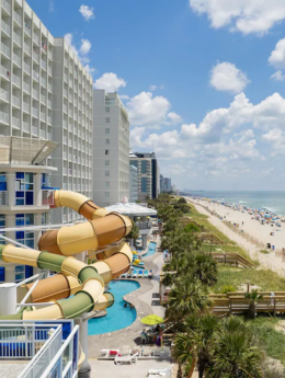 Crown Reef Beach Resort and Waterpark is a vibrant oceanfront destination designed with families in mind. The resort boasts extensive indoor and outdoor waterparks, multiple pools, lazy rivers, and hot tubs. Spacious rooms with balconies, on-site dining, and direct beach access provide nonstop entertainment, making it a popular choice for fun-filled Myrtle Beach vacations.